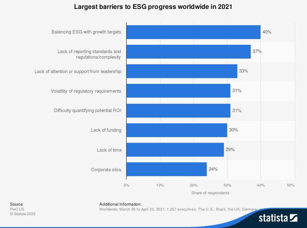 A PwC survey conducted in 2021 revealed that a lack of support from leadership has a notable impact on the success of a company’s sustainability program. Of all the factors that are considered barriers to ESG progress, leadership influence is the third largest metric at 33%.