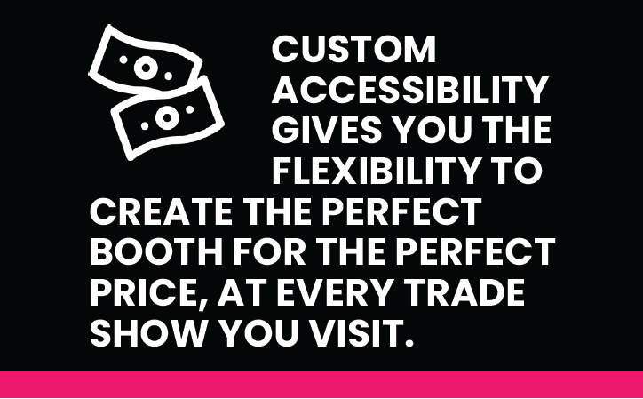 Custom accessibility gives you the flexibility to create the perfect booth for the perfect price, at every trade show you visit. It allows you to maximize your exhibit’s marketing potential, eliminates the stress associated with operations and logistics, and guarantees that you don’t go over budget on expected fees.